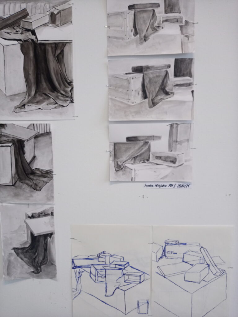 Rysunki i obrazy powstały w wyniku realizacji studiów w trybie hybrydowym – zdalnie i stacjonarnie w roku akademickim 2019/2020 i 2020/2021.