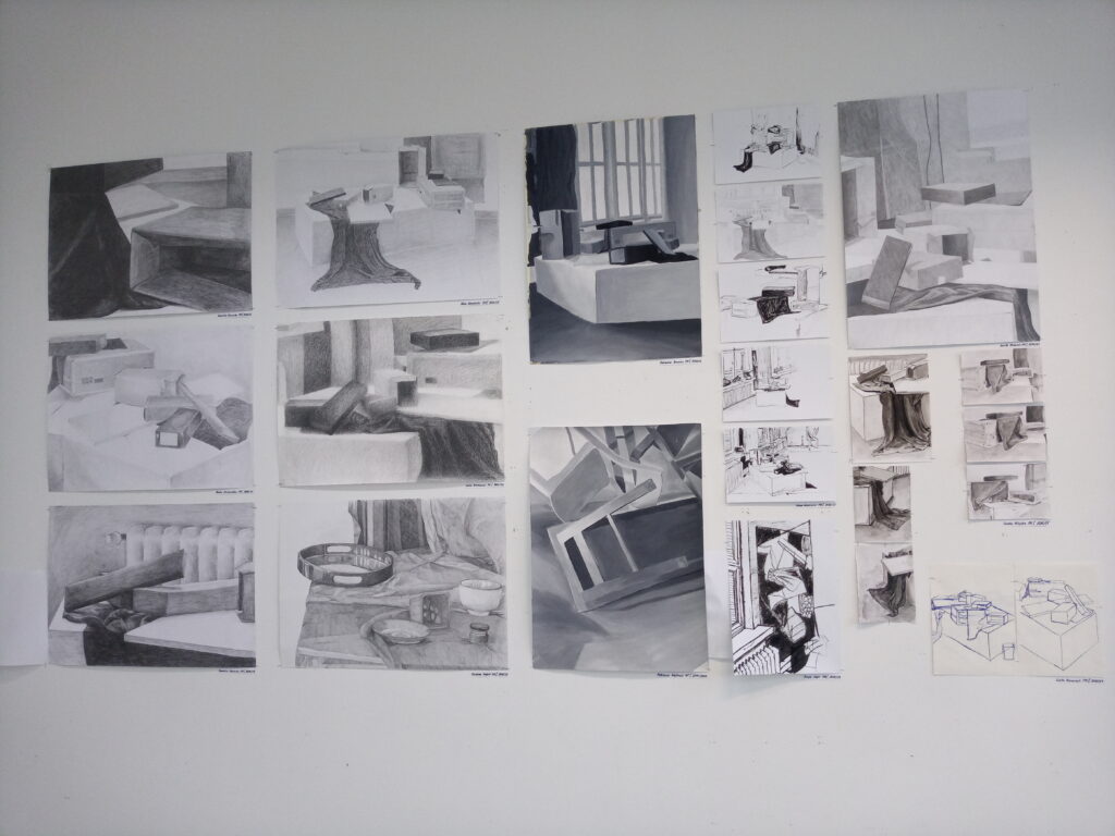 Dotyczą one analizy pojedynczych obiektów – form naturalnych (wprowadzenie do bioniki); studium przestrzeni – wnętrza, – w ujęciu układu przedmiotów (martwej natury) – relację formy i przestrzeni (wprowadzenie do projektowania przestrzennego).